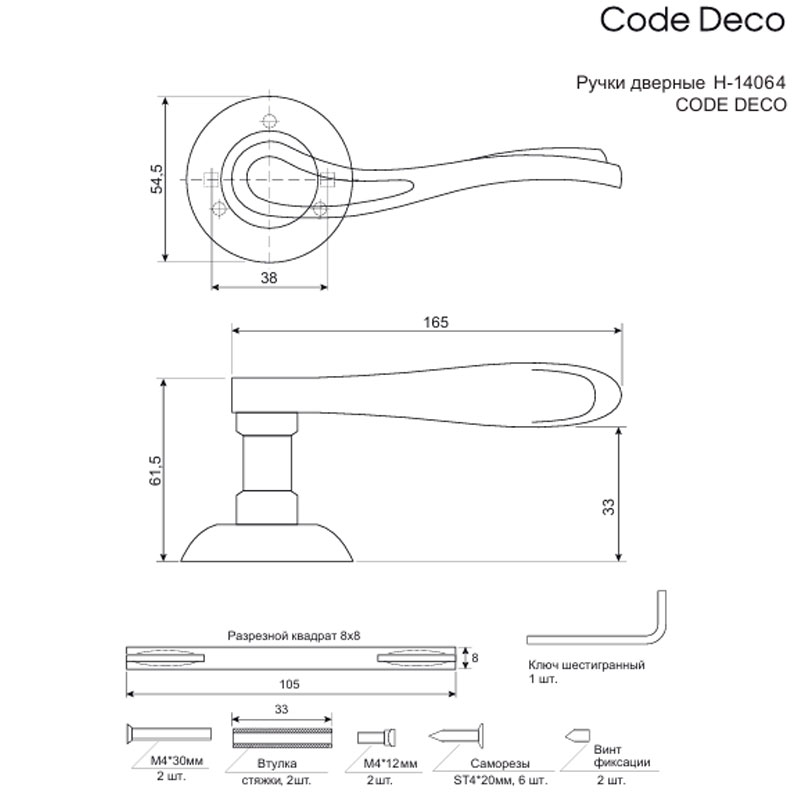 Прочная и надёжная система крепления ручки на установочной розетке предотвратит образование люфтов, значительно продлит срок службы дверной фурнитуры. Стяжные винты в комплекте обеспечивают жесткое крепление на полотне двери. В комплект дверных ручек также входят: стяжные винты, соединительный квадрат, саморезы, фиксирующие винты, ключ-шестигранник.