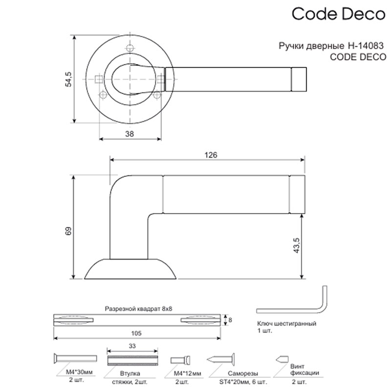 Прочная и надёжная система крепления ручки на установочной розетке предотвратит образование люфтов, значительно продлит срок службы дверной фурнитуры. Стяжные винты в комплекте обеспечивают жесткое крепление на полотне двери. В комплект дверных ручек также входят: стяжные винты, соединительный квадрат, саморезы, фиксирующие винты, ключ-шестигранник.