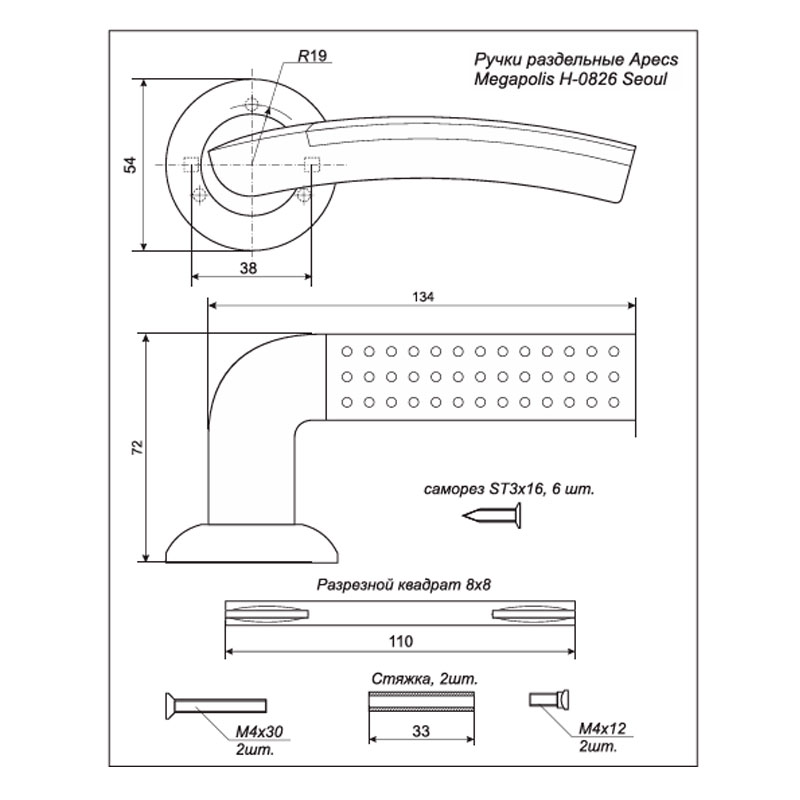 Прочная и надёжная система крепления ручки на установочной розетке предотвратит образование люфтов, значительно продлит срок службы дверной фурнитуры. Стяжные винты в комплекте обеспечивают жесткое крепление на полотне двери. В комплект дверных ручек также входят: стяжные винты, соединительный квадрат, саморезы, фиксирующие винты, ключ-шестигранник.